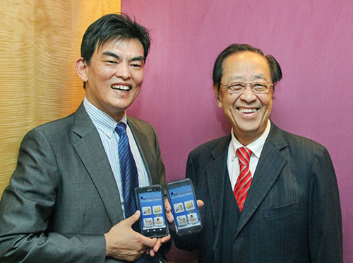 魏基成先生(右)與吳志賢總經理聯手發布了聽力自檢軟件(攝影 姜長庚)