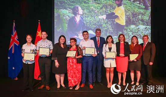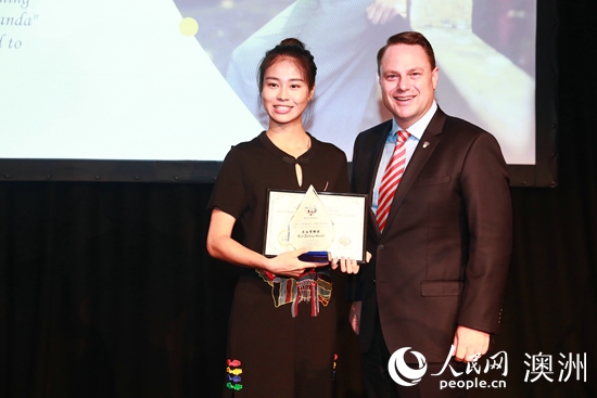 中國駐布里斯班總領事徐杰以及昆州代理州督凱瑟琳·霍姆斯為“最具中國人氣獎”獲獎者父親頒獎(攝影 任健聰)