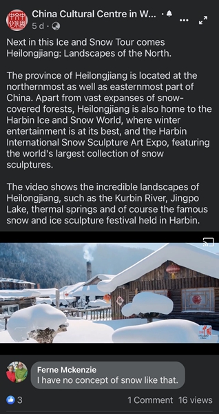 惠靈頓中國文化中心通過官方臉書發布“美麗中國·冰雪之旅”系列微視頻